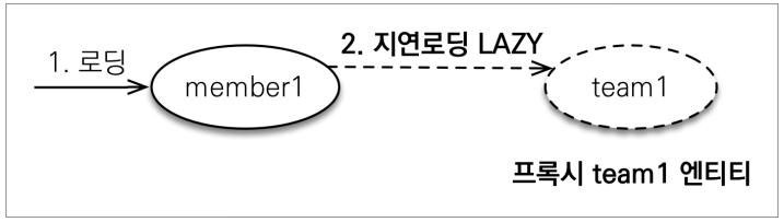 Member member = em.find(Member.class, "member1"); //지연 로딩 실행 코드