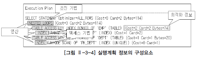 SQL 옵티마이저 7.1 통계정보와 비용 계산 원리 7.1.1 선택도와 카디널리티 선택도(Selectivity)란, 전체 레코드 중에서 조건절에 의해 선택되는 레코드 비율을 말하낟. 가장 단순한 ‘=’ 조건으로 검색할 때의 선택도만 살펴보면, 컬럼 값 종류 개수(Number of Distinct Values, 이하 ‘NDV’)를 이용해 아래와 같이 구한다. 선택도 = 1 / NDV 카디널리티(Cardinality)란, 전체 레코드 중에서 조건절에 의해 선택되는 레코드 개수이며, 아래 공식으로 구한다. 카디널리티 = 총 로우 수 * 선택도 = 총 로우 수 / NDV 7.1.2 통계정보 통계정보에는 오브젝트 통계와 시스템 통계가 있다. 오브젝트 통계는 다시 테이블 통계, 인덱스 통계, 컬럼 통계(히스토그램 ..