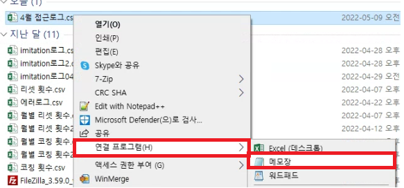 5. 저장한 파일을 우측 클릭해서 [연결 프로그램] → [메모장]으로 켜준다.