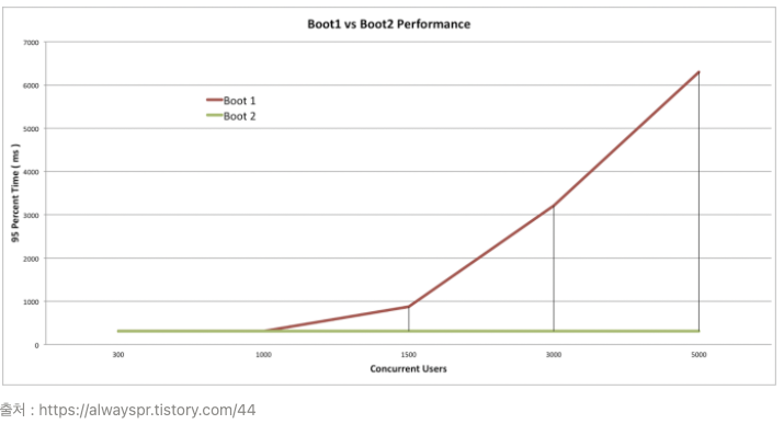 Boot1 은 RestTemplate을 사용하고 Boot2 는 WebClient 를 사용한다. 동시 사용자가 1,000명까지는 처리속도가 거의 비슷하지만 그 이후에서는 RestTemplate(Boot1) 이 급격하게 느려지는 것을 볼 수 있다. 동시 사용자의 규모가 별로 없다면 RestTemplate을 사용하는 것은 별문제 없지만 어느정도의 규모가 있다면 WebClient를 선택하는 것이 바람직해 보인다.