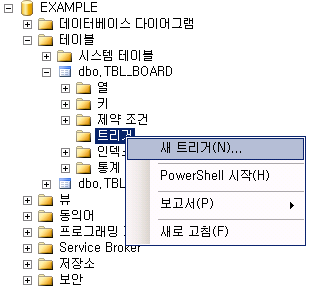 - 새 쿼리 만들기에서 트리거 쿼리를 직접 작성하여 생성해도 되고, 아래 그림처럼 트리거 메뉴를 통해서 트리거를 생성해도 됩니다. (아래 처럼 새 트리거 메뉴를 통해서 생성하면 트리거 기본 코드를 생성하여 줍니다.)