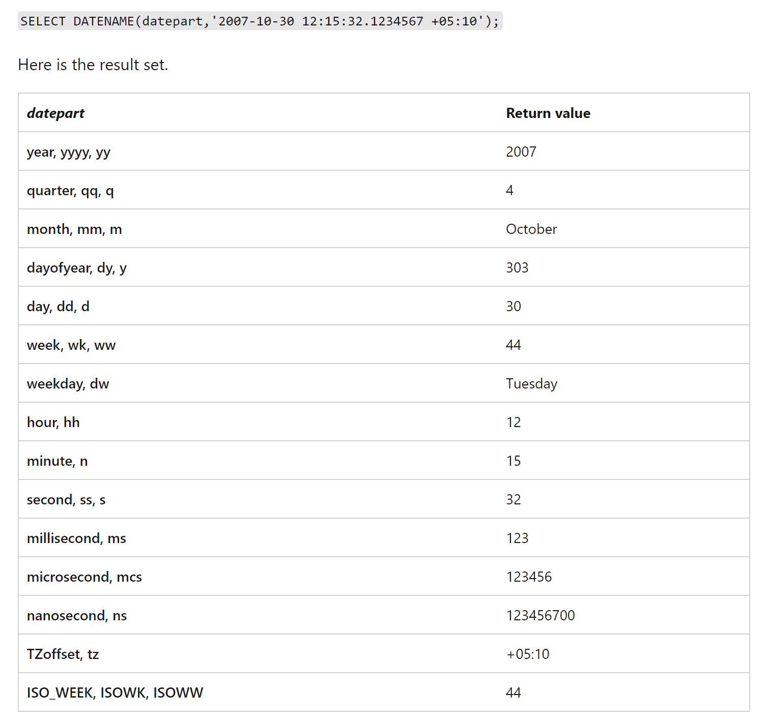 MSDN자료를 살펴보면 DATENAME(datepart,날짜형)부분에 datepart는 아래와 같은 항목을 지원하니 적절하게 필요한경우 사용하면됩니다.