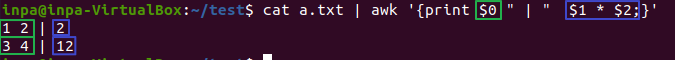 $0는 한 행을 의미하고, $1 는 그 행의 첫번째 필드, $2 는 두번째 필드가 되는 것이다.
