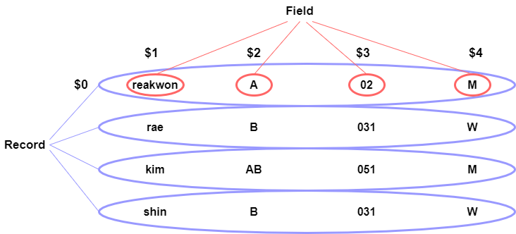 AWK 프로그래밍 문법에서는 레코드가 $0, 그리고 $1, ..., $N은 각 필드 인자를 나타내게 프로그래밍 되어 있다.