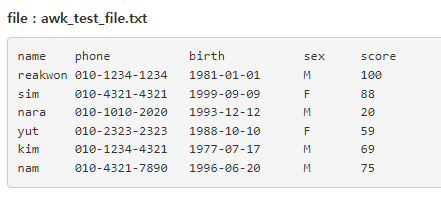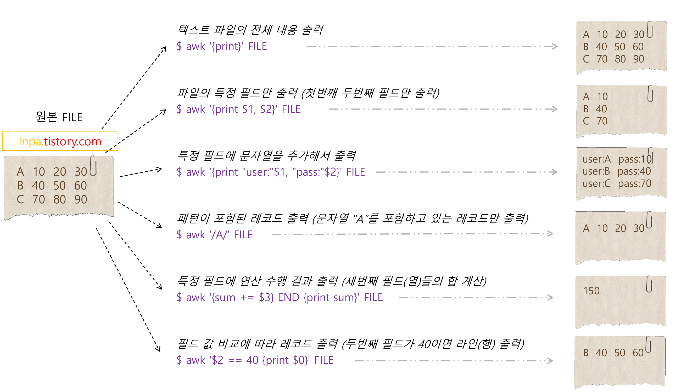 AWK (Aho Weinberger Kernighan) 개념 AWK는 텍스트가 저장되어 있는 파일을 원하는 대로 필터링하거나 추가해주거나 기타 가공을 통해서 나온 결과를 행과 열로 출력해주는 프로그램 이다. 좀더 쉽게 말