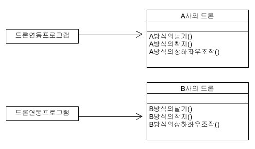 하지만 새롭게 출시한 B 드론이 더 가격이 싸고 성능도 좋다. 그렇다면 A 드론과 연동한 프로그램 수정은 불가피하다. 이럴 경우 프로그램은 어느 회사의 제품 드론이 연동하던 프로그램의 수정을 최소화 하면서 확장적으로 다른 제품의 드론과 연동할 수 있어야 한다.