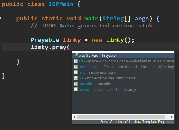 참조 변수 타입을 Prayable 타입으로 정의 하고 Limky 인스턴스를 받으면 자동 타입 변환이 발생하면서 upcating 되기 때문에 limky 참조 변수는 기본적으로 상위클래스 즉 Prayable 의 역할만 하게 된다.