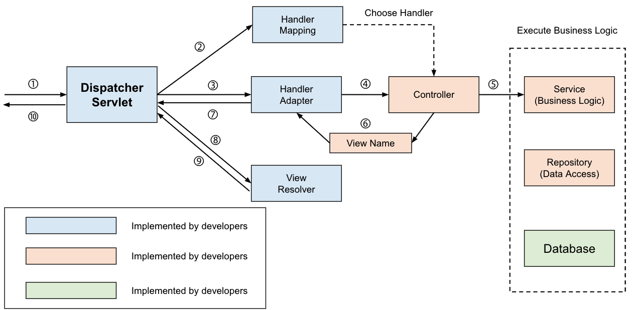 전통적인 Spring MVC의 컨트롤러인 @Controller는 주로 View를 반환하기 위해 사용합니다. 아래와 같은 과정을 통해 Spring MVC Container는 Client의 요청으로부터 View를 반환합니다.