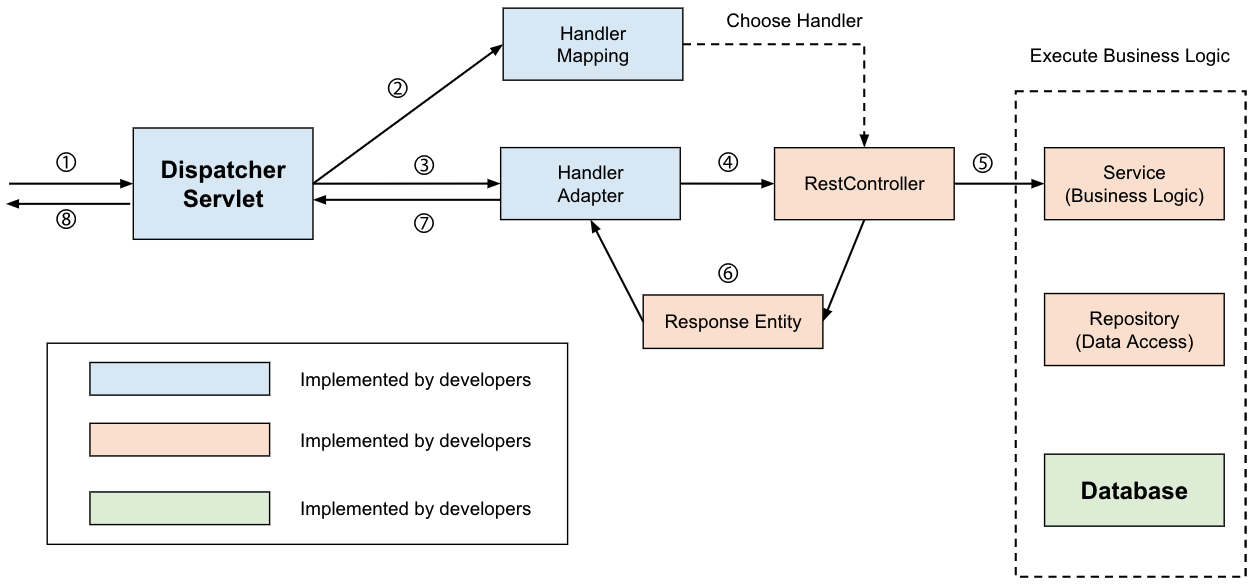 @RestController는 @Controller에 @ResponseBody가 추가된 것입니다. 당연하게도 RestController의 주용도는 Json 형태로 객체 데이터를 반환하는 것입니다. 최근에 데이터를 응답으로 제공하는 REST API를 개발할 때 주로 사용하며 객체를 ResponseEntity로 감싸서 반환합니다. 이러한 이유로 동작 과정 역시 @Controller에 @ReponseBody를 붙인 것과 완벽히 동일합니다.
