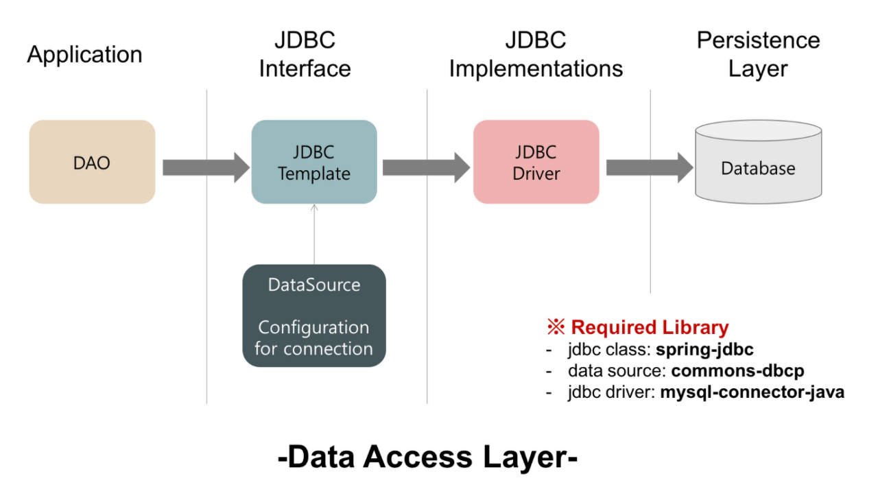 - DAO에서 Database에 접근하기 위해서는 Spring-jdbc가 필요하고, 이는 DataSource 정보로부터 구할 수 있다.