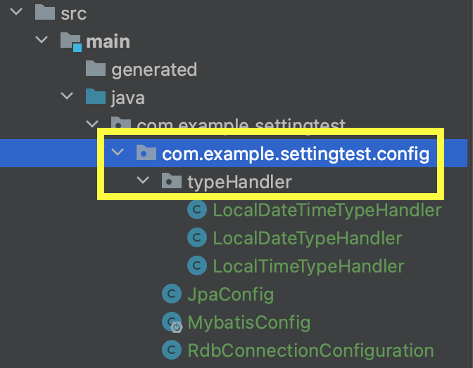 - java → 루트 패키지(예 : com.example.settingtest)의 하위에 config 패키지를 만들고 하위에 typeHandler패키지를 만든다.