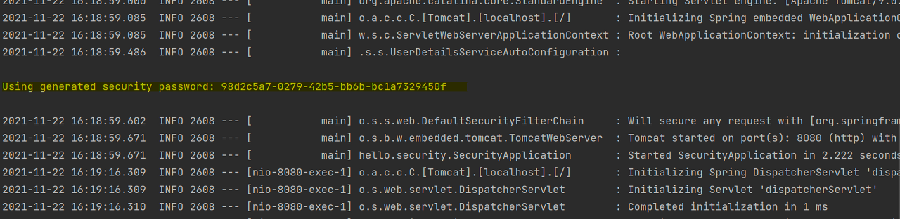 - 프로젝트를 실행하니 처음 보는 security password가 콘솔에 찍히게 된다.