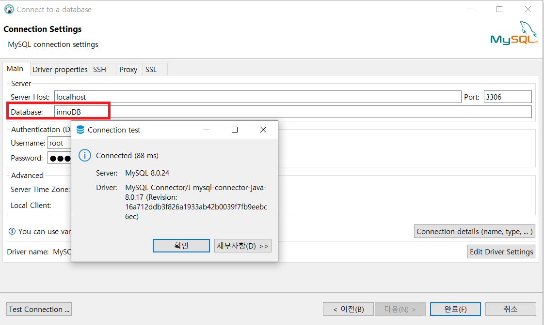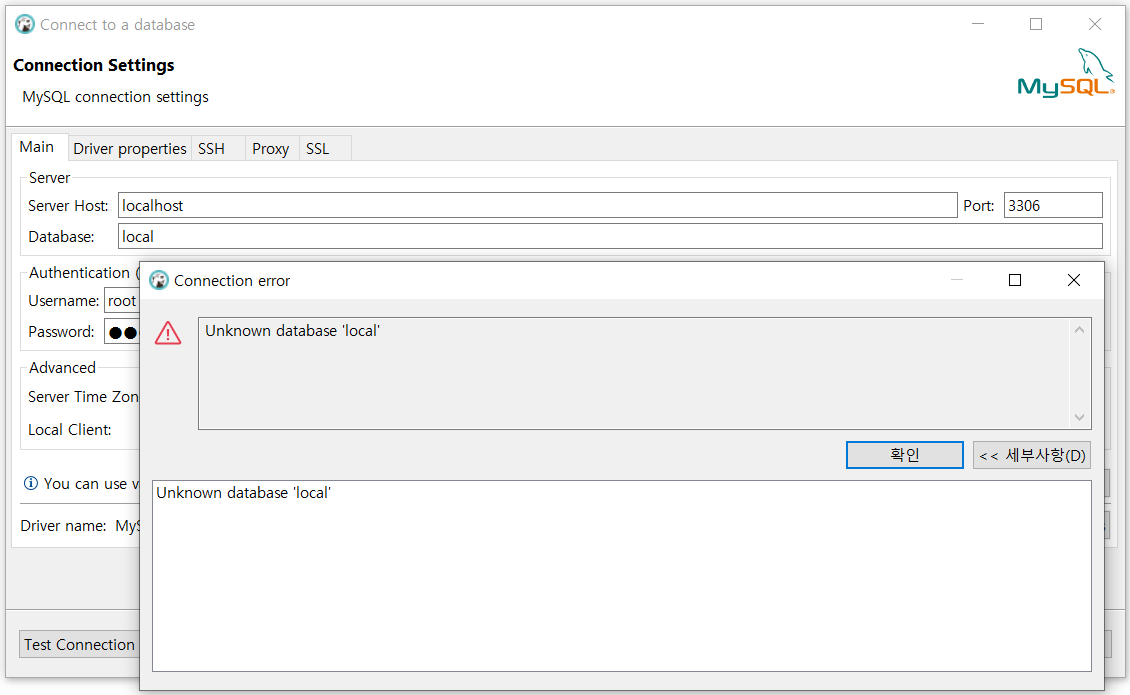 Dbeaver에서 유저이름과 암호를 정확히 입력하였는데, 위와 같은 에러가 발생한다면 Database이름을 확인할 것