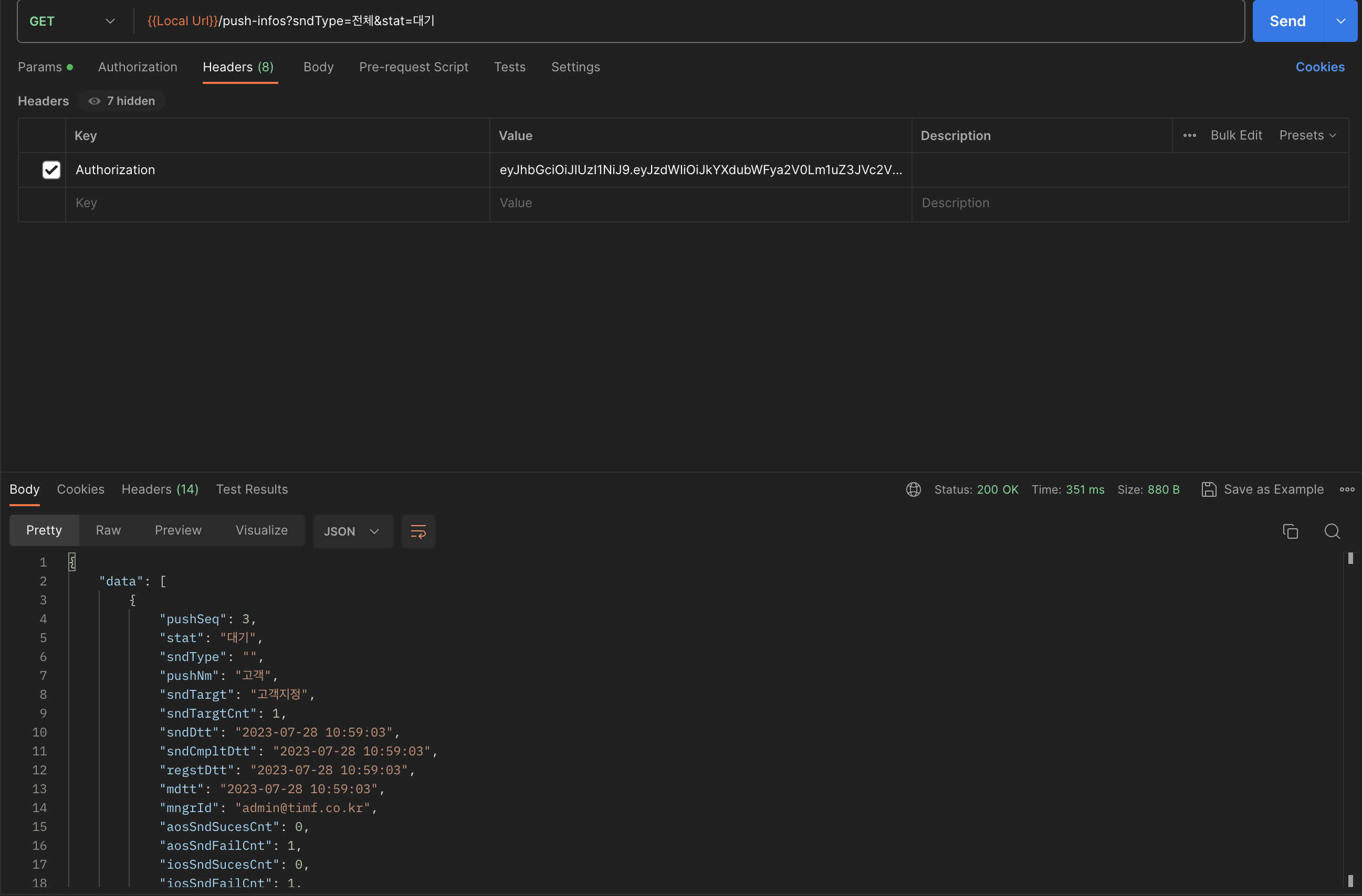 - 해결 - Postman에서 API 요청할 때, Authorization 탭 대신 Headers 탭에서 Key 컬럼에 Authorization을 입력하고 Value 컬럼에 로그인에서 생성한 JWT 토큰을 입력하였다. 그 후, 정상적으로 JWT 요청을 완료할 수 있었다.