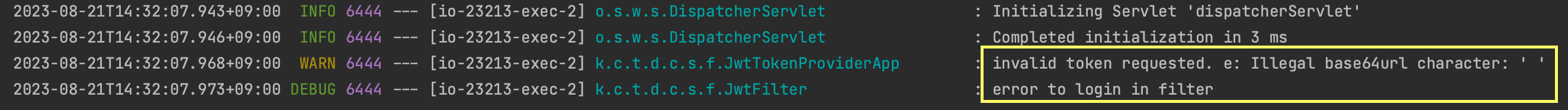- 에러 로그의 이유는 토큰값을 분해할 때 Base64 형식으로 decode 된 secret key를 사용하여 토큰을 분해하게 되는데, 그 과정에서 오류가 발생하는 것 같다(Base64 형식은 ' '(공백) 을 인식할 수 없다는 것이 이유).