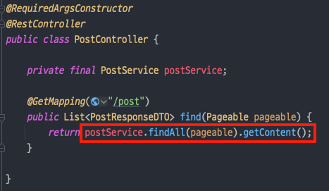- 그리고 Controller 로직에서 getContent() 메소드를 사용해서 List<PostResponseDTO>를 반환하도록 수정한 후에 페이징 요청을 해보겠습니다.