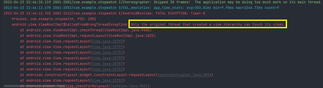- 위와 같이 스톱워치 시작 기능을 개발한 후, 앱을 실행하면 아래와 같은 에러 메시지가 뜬다.