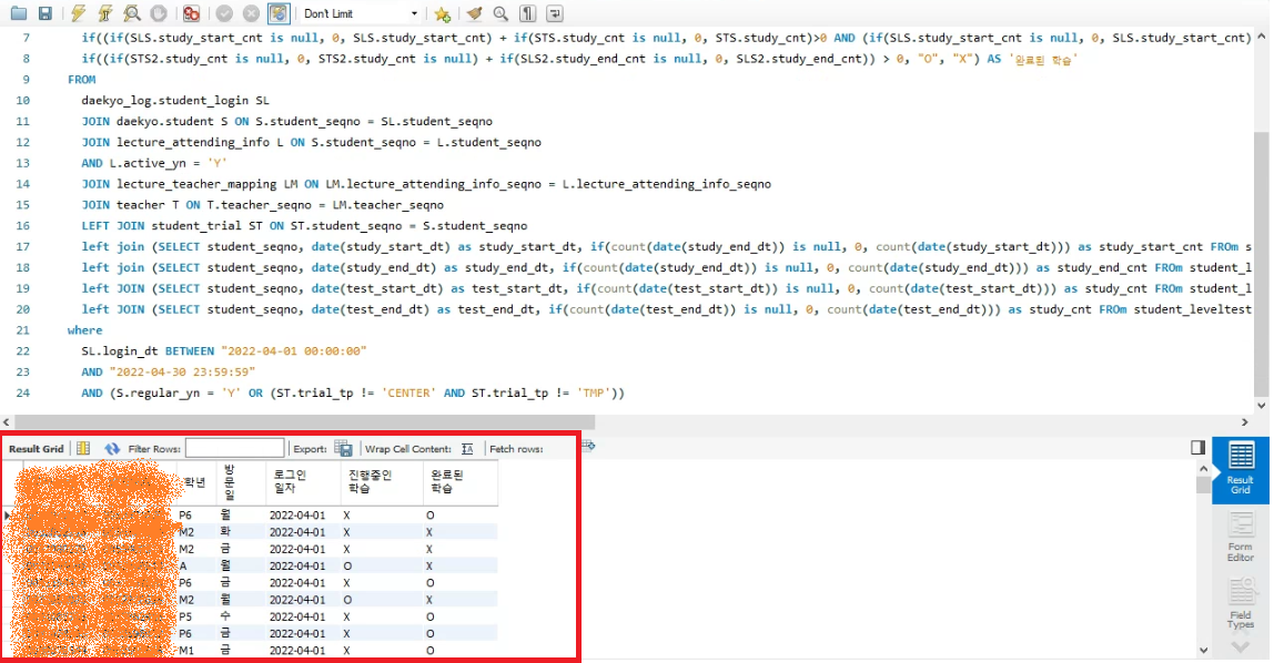 9. 엑셀 파일에 쿼리 결과가 잘 출력되었는지 확인한다. 끝