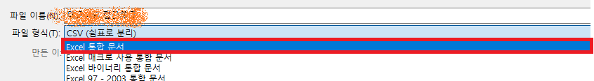 8. [파일]->[다른 이름으로 저장]을 누르고, [파일 형식]을 CSV에서 Excel 통합 문서로 변경해준다.