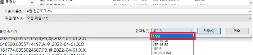 이 창에서 [파일 형식]을 txt에서 모든 파일로 변경해주고 [파일 이름] 뒤에 .csv를 붙여준다.