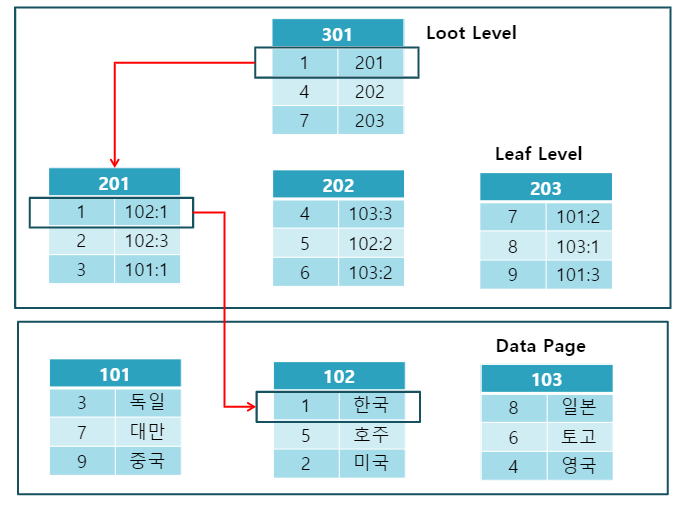 Clustered 인덱스의 구조이다. Data Page 의 데이터들이 순차적으로 정렬되어있다. 그리고 Leaf level 과 DataPage가 동일한 구조를 갖는다.