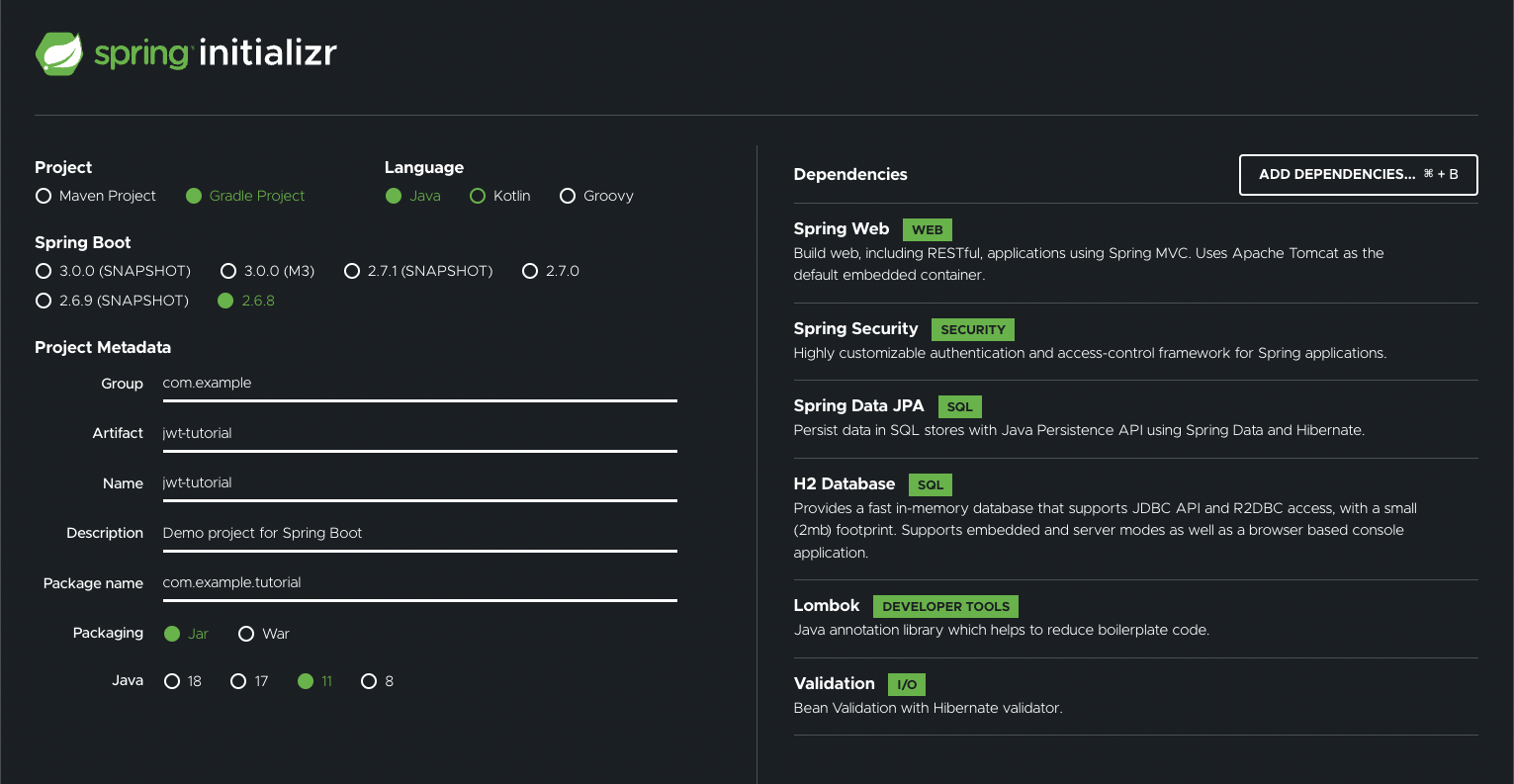 프로젝트 생성 자바 버전은 11로 하였고 아래의 Dependencies를 추가해줍니다. Spring Web Spring Security Spring Data JPA H2 Database Lombok Validation 테스트 컨트롤러 생성 해당 프로젝트가 잘 작동하는지 테스트 하는 컨트롤러를 만들어줍니다. @RestController @RequestMapping("/api") public class HelloController { @GetMapping("/hello") public ResponseEntity hello(){ return ResponseEntity.ok("hello"); } } Postman으로 GET요청을 했을때 401인증오류가 뜨는 것을 볼수 있습니다. SecurityConfig를 생성..